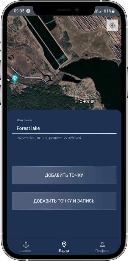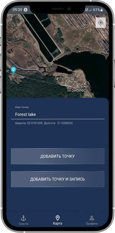 Удобная карта, на которой можно отмечать любимые места для рыбной ловли и смотреть прогноз клева в данной точке.